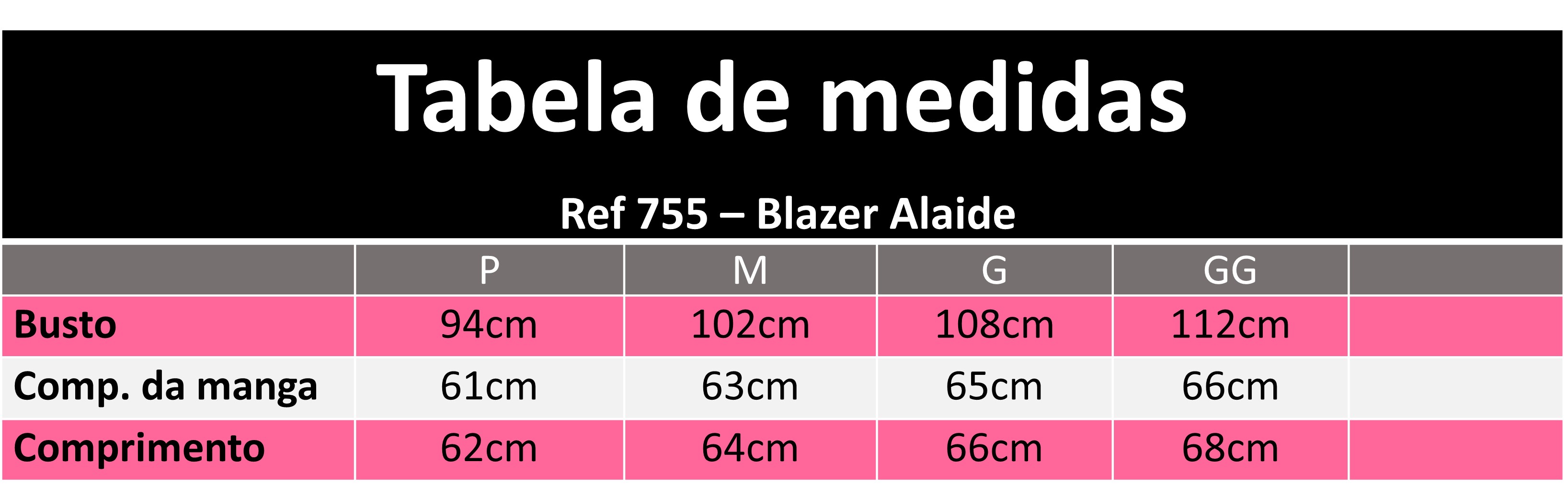 Sua modelagem é mais ajustada na cintura que valoriza o corpo e alonga a silhueta, fechamento frontal com dois botões, recortes frontais e traseiros para a cinturar a peça, por dentro toda forrada, possui ombreiras médias. Tecido macio, e confortável.